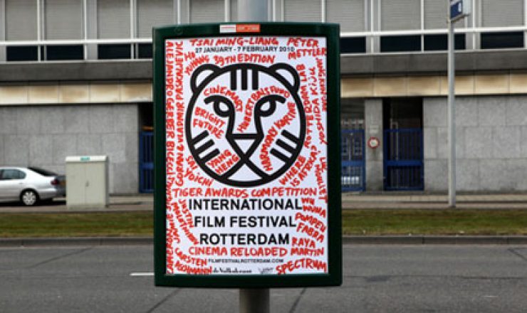 Street art op IFFRGekladder met een rode merkstift op 'n oud filmaffiche; dat is het nieuwe ontwerp van grafisch bureau...