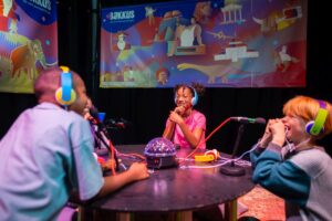 Weer heel iets anders is Bakkus de verhalenverslinder, de andere Open Call-winnaar, gemaakt door Hay Kranen en Nienke Huitenga-Broeren. Hier reizen kinderen niet zelf door de tijd, maar improviseren ze samen met een AI-stem allerlei verhalen die door verschillende tijdperken gaan. Zo kan het van start gaan in het oude Parijs maar ook in Japan.