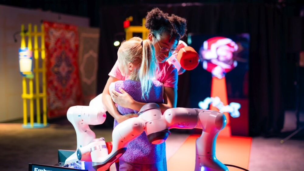Veel van de interactieve installaties op het MediaLab maken dit jaar gebruik van AI, en soms zou je dat op zichzelf al een kleine blik in de toekomst kunnen noemen. Bij de opvallende installatie Embrace Angels van Karen Lancel en Hermen Maat kan je bijvoorbeeld zien hoe twee stoer ogende maar voorzichtig bewegende robotarmen proberen te leren hoe je iemand moet omhelzen. Jouw rol is om ze het voorbeeld te geven. Ik ben heel benieuwd of die armen het aan het eind van de Cinekid-week al een beetje kunnen.