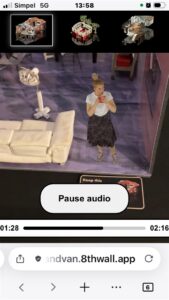 Om dezelfde reden hebben ze, na uitgebreid testen van een eerste versie, een ‘cinematic’ optie ingebouwd waarin je de hele ervaring passief ervaart, als 360-film, omdat bleek dat sommige onervaren, met name oudere bezoekers het ‘teleporteren’ (je door de ruimte bewegen door ergens op te richten en dan op een knop te drukken) ingewikkeld en afleidend vonden. “Sommigen waren bang om iets kapot te maken; je weet hoe oudere mensen kunnen zijn met digitale technologie”, glimlacht Knowles. “En dus dachten we: oké, een versie zonder interactie is dus nuttig, en niet zo moeilijk om te maken, dus hebben we dat maar gewoon gedaan.” Deze keuzemogelijkheid voor passiviteit heb ik nog niet eerder gezien en lijkt me voor meer interactieve werken een mooie, toegankelijke optie.