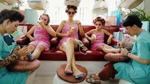 Wie bij sociaalrealisme automatisch aan somberheid denkt, wordt meteen op het verkeerde been gezet. Treat Her Like a Lady speelt zich af in een kleurrijk, bijna overdadig palet. Kostuums, interieurs, muziek: in alles is het net iets groter. De referenties lopen van Mermaids (Richard Benjamin, 1990) met Cher tot Spike Lee’s Do the Right Thing (1989), van de Italiaanse komedie Ieri, oggi, domani (Vittorio De Sica, 1963) tot de foto’s van Martin Parr en de pastelkleuren van Jacques Demy’s Les parapluies de Cherbourg (1964). Maar de werkelijke bron is dichter bij huis. “Armoede is voor mij nooit grijs geweest. Ik wilde de vitaliteit en energie laten zien die ik om me heen zag, ook als het thuis financieel niet meezat. Te vaak zien we de arbeidersklasse op een heel grauwe manier afgebeeld worden.”