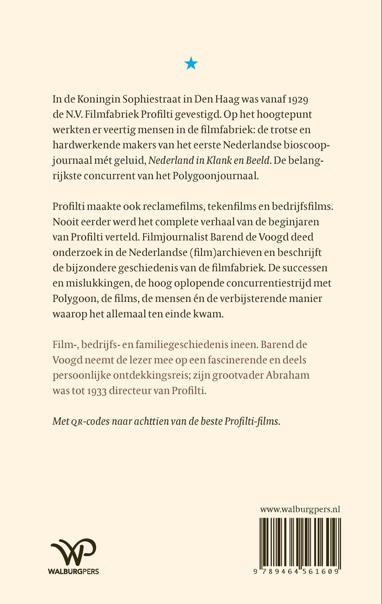 Filmjournalist Barend de Voogd deed onderzoek in de Nederlandse (film)archieven en beschrijft de bijzondere geschiedenis van de filmfabriek. De successen en mislukkingen, de hoog oplopende concurrentiestrijd met Polygoon, de films, de mensen én de verbijsterende manier waarop het allemaal ten einde kwam. Film-, bedrijfs- en familiegeschiedenis ineen. De Voogd neemt de lezer mee op een fascinerende en deels persoonlijke ontdekkingsreis; zijn grootvader Abraham was tot 1933 directeur van Profilti. Met QR-codes naar achttien van de beste Profilti-films.