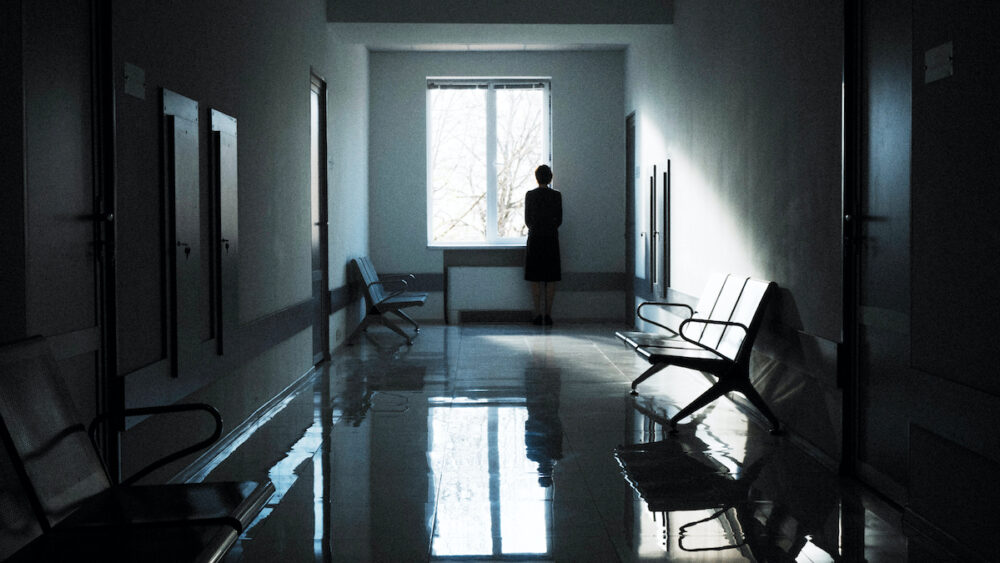 April is een film waarin camera en hoofdpersonage ingenieus met elkaar vervlochten zijn. Soms valt de camera van cinematograaf Arseni Khachaturan samen met Nina’s blik. Op andere momenten vat de camera niet haar letterlijke gezichtspunt, maar wel haar gemoedstoestand. Zoals tijdens die bevallingsscène, waarin de camera haar kalmte en overzicht verbeeldt. Het hielp haar niet het kind te redden. En dan zijn er nog de momenten, zoals in die ziekenhuisgang, waarop het is alsof de camera net buiten Nina’s realiteit staat en haar bespiedt als in een kijkdoos. Alsof ze zichzelf van buitenaf ziet.