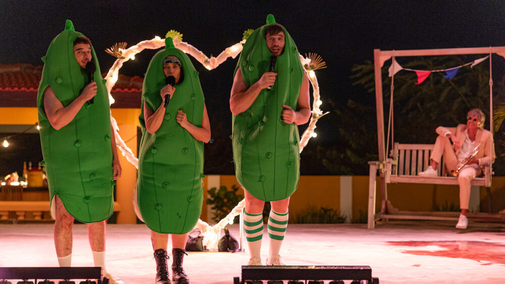 Een bruiloft in dirndl en lederhosen komt uit de lucht vallen. Geheel voorspelbaar is dan weer een met A-Team-achtige lulligheid gefilmde knokscène met het duo geldbeluste zwagers, van wie onduidelijk is waarom de halfzussen ooit met hen getrouwd zijn. Augurk aan zee wordt aangeprezen als een ‘zoetzure komedie’, maar smaakt naar ingelegde brokjes kots. Uit een doucheputje.