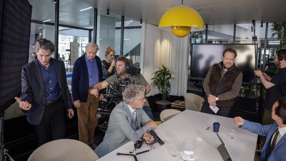 In zaal Phelps – alle zalen in EDGE Workspaces zijn vernoemd naar Olympische sporters – is DoP Jorrit Garretsen, die in 2023 ook al De Cloe’s Zomer in Frankrijk draaide, bezig de hoek van het shot te bepalen. Aan de ene kant van de grote tafel worden drie stoelen neergezet, aan de andere kant staat een net wat hogere draaistoel voor de bankmedewerker. In de hoek van het glazen kantoor staat een enorme banier met de tekst: “Holland Bank – Je hebt alleen een goed idee nodig.”