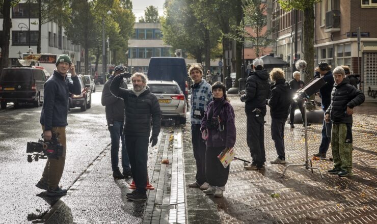 Hans Kesting (links) en Leon Voorberg op de set van Win/win. Camera Jan Moeskops; regisseur Jaap van Heusden kijkt toe.