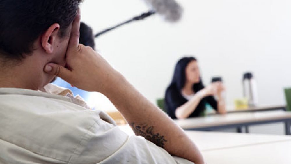 Regiseusse Yasemin Samredeli van Almanya bezocht vorig jaar na het uitreiken van de Behind the Scenes Award de gedetineerdenjury in Merksplas en sprak met hen na over de film. Beeld uit de documentaire Behind the Scenes.