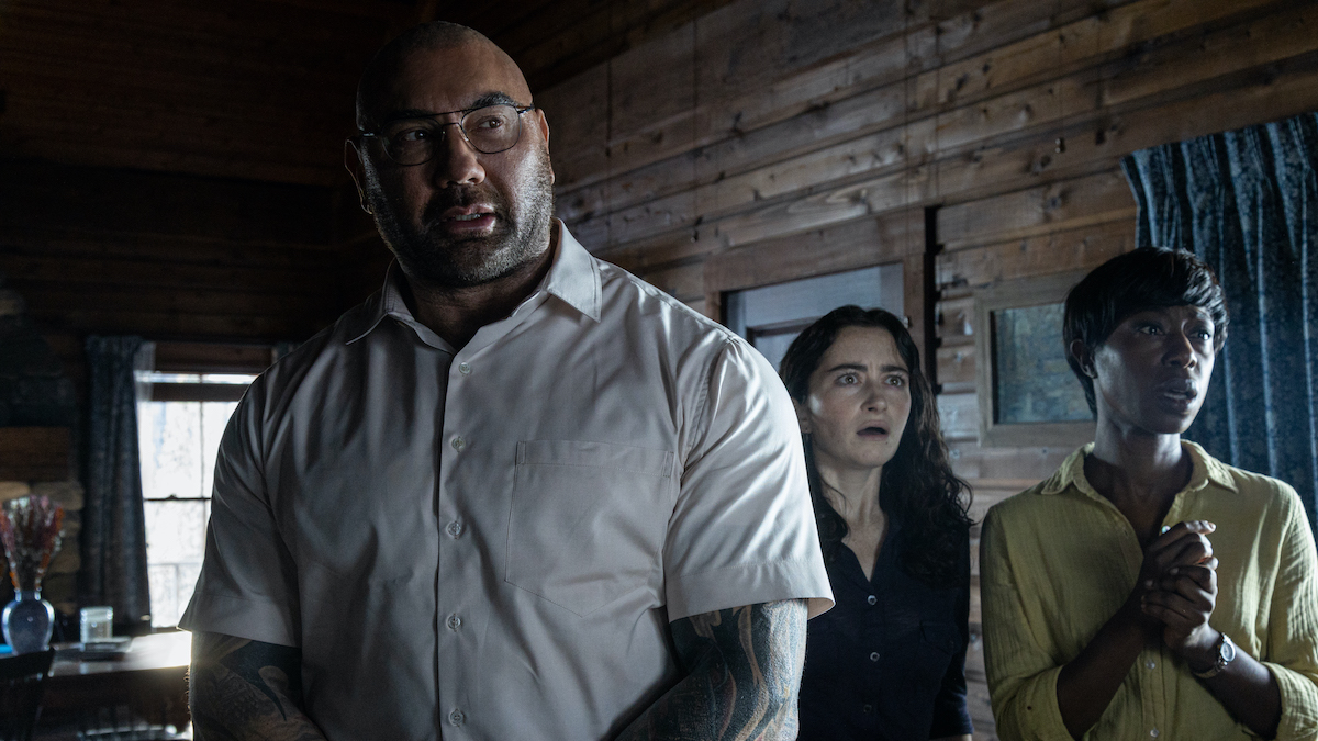 KNOCK AT THE CABIN Datum 08-01-2023 Auteur KEES Driessen Deel dit artikel From left: Dave Bautista, Abby Quinn, and Nikki Amuka-Bird in KNOCK AT THE CABIN, directed and co-written by M. Night Shyamalan