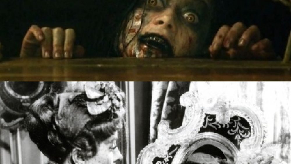 Je zou denken dat dit soort films geen overeenkomsten hebben, maar laten we eens kijken. Je ziet hier een still uit beide films. Voor de grap heb ik twee momenten gekozen die visueel overeenkomen. Op beide zie je hoe een vrouwenhoofd aan de rechterkant van het scherm naar rechts buigt en is ingekaderd; de ketenen op het eerste beeld zijn een vage echo van het sierlijke omhulsel van de Italiaanse spiegel in het tweede beeld. De ogen in beide beelden vangen de blik van onze ogen op, zoals ogen plachten te doen. In de horrorfilm is de vrouw een junkie met een cold turkey, en alsof dat nog niet erg genoeg is, bezeten wordt door een boze geest. In Madame de… is de vrouw verlamd door kille huwelijksjaren, en dan komt er iets nieuws haar leven binnen: de gepassioneerde liefde voor een baron.